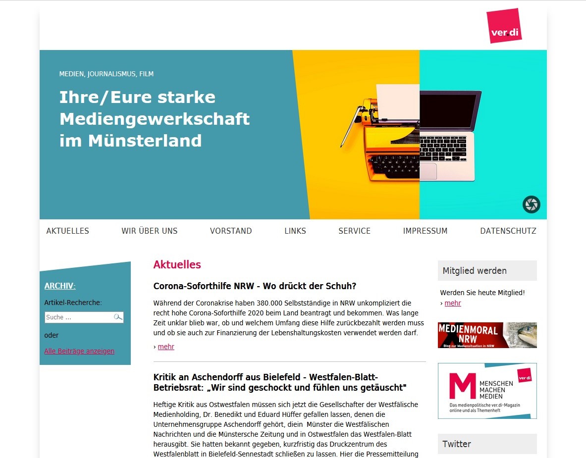 Die Journalistengewerkschaft in der großen Dienstleistungsgewerkschaft ver.di für den Bereich Münsterland erhielt ein neues Webdesign.