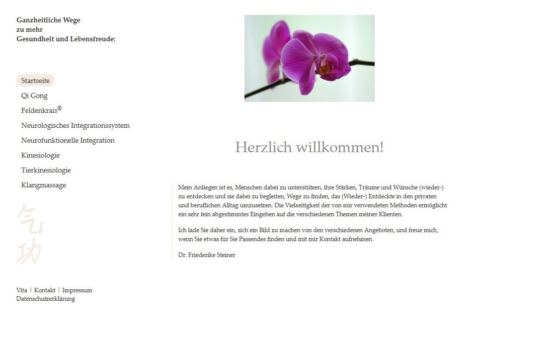 Dr. Friederike Steiner bietet Seminare und Einzelstunden in den Bereichen Qi Gong, Taiji quan und Feldenkrais sowie Kinesiologie, Tierkinesiologie und Reiki an.