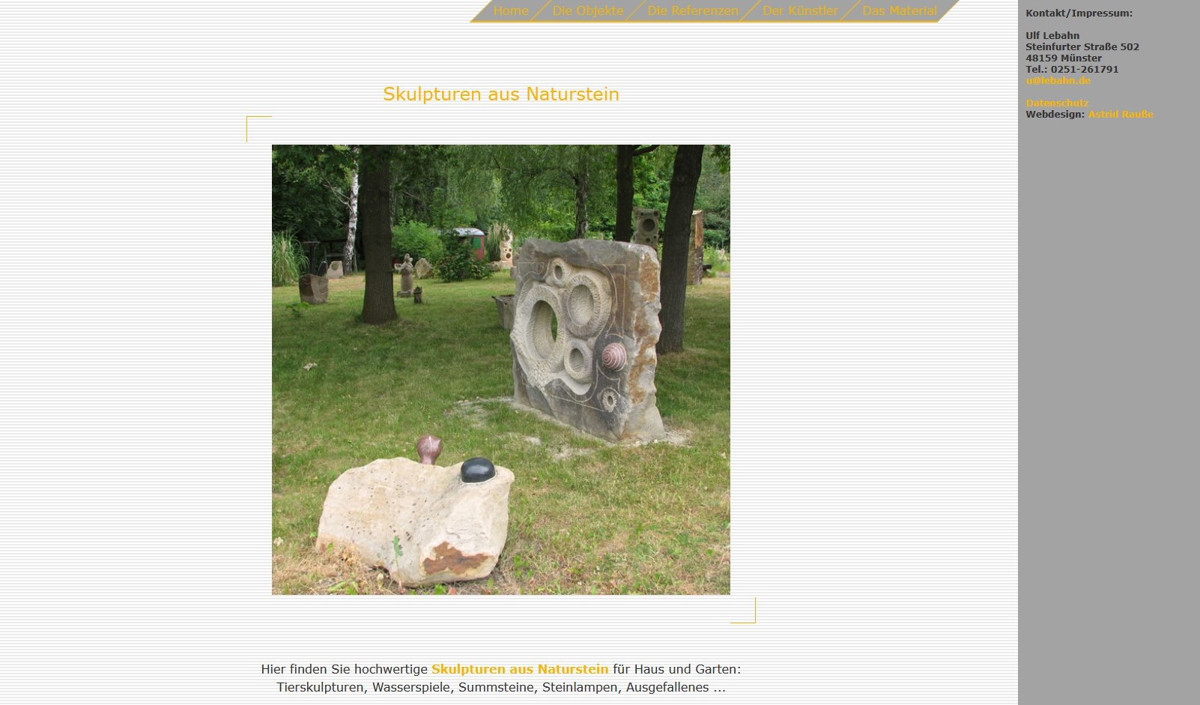 Die Internetpräsenz des Münsteraner Bildhauers Ulf Lebahn ist so gestaltet, dass der Besucher der Website wie in einem Katalog blättern kann. Alle Objekte sind außerdem auf einer Übersichtsseite kategorisiert.